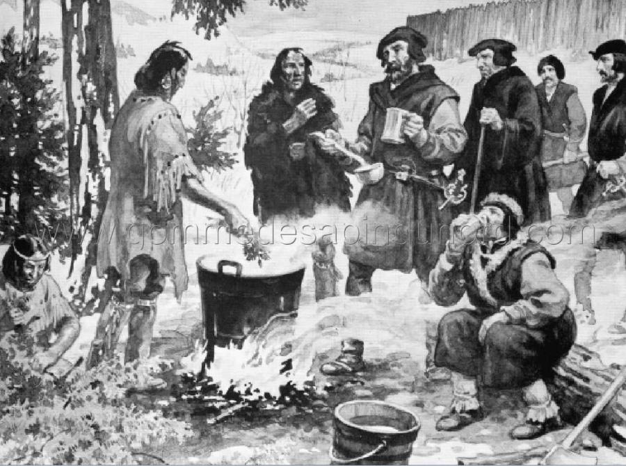 Jacques Cartier rencontre par hasard Domagaya, le fils du chef amérindien de Stadaconé (Québec), en bonne santé alors qu’il souffrait du même mal que ses hommes une semaine plus tôt. Cartier s'enquiert du remède à Domagaya. L'Amérindien répond aux interrogations de Cartier en lui parlant de l’annedda, un arbre dont les rameaux qui pilés et mélangés à l'eau permettent une guérison rapide. Il envoie deux femmes accompagner Jacques Cartier pour cueillir les branches et l'écorce de l'arbre et pour lui indiquer comment les faire bouillir. En six jours, le savoir-faire amérindien guérit totalement les membres de l’équipage, même ceux atteints de vérole depuis plusieurs années. »